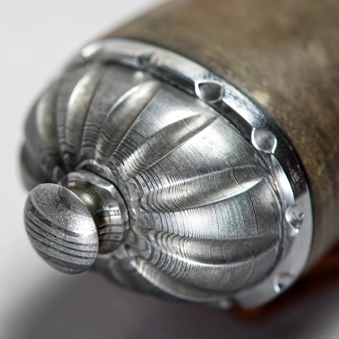 320 Lagen aus 1.2842 und 75Ni8, Raindropdamast; Parierelement aus geschmiedetem Damast, Knauf aus 500-Lagen-Damast, Lederscheide mit Damastverbremungen.