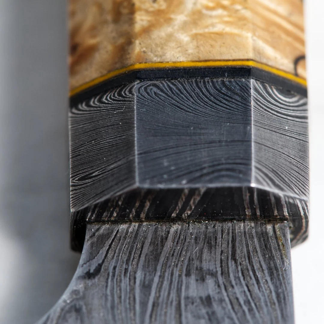 Griff aus stabilisierter Maserbirke mit Damastabschlüssen ( Balance!)